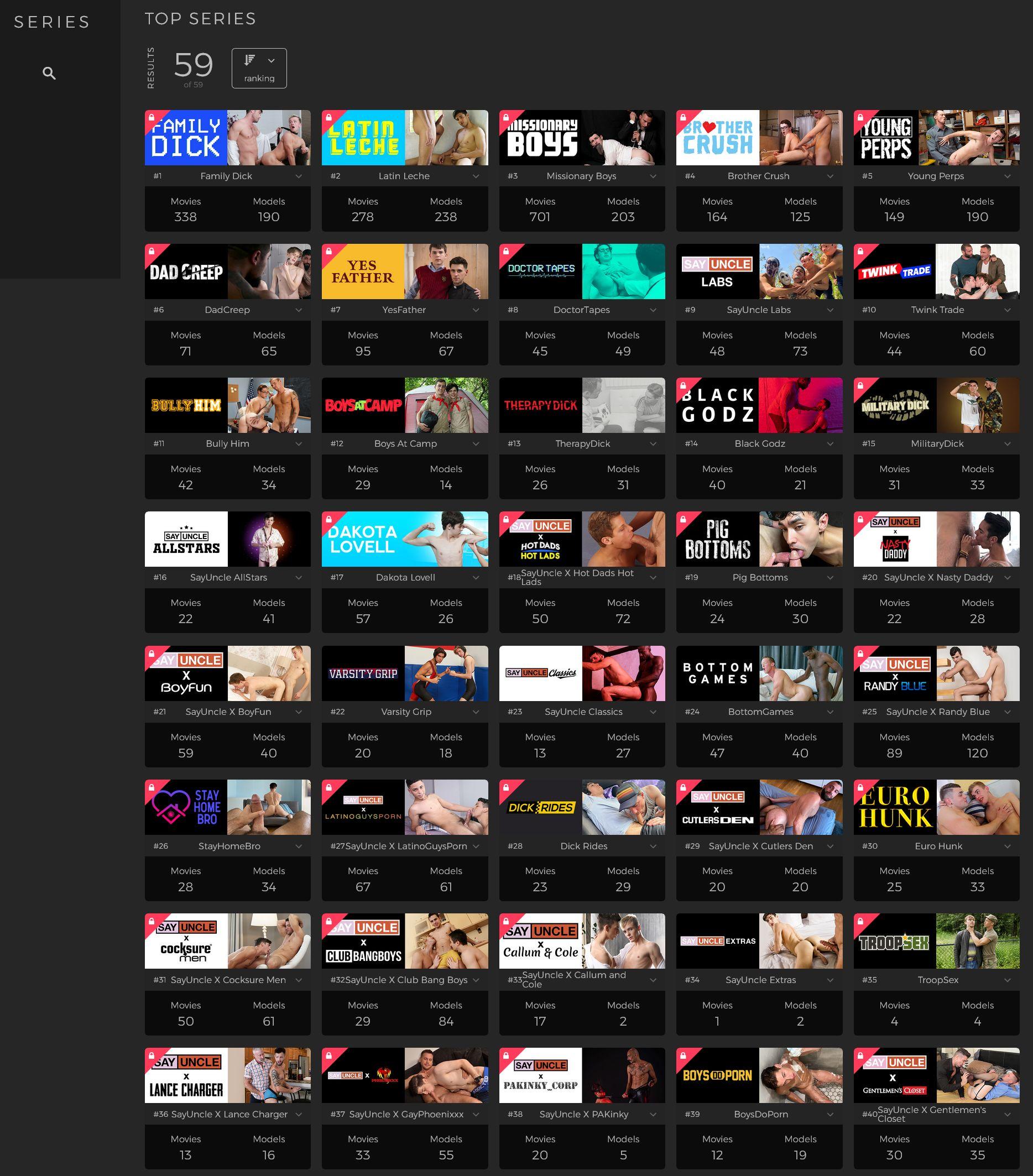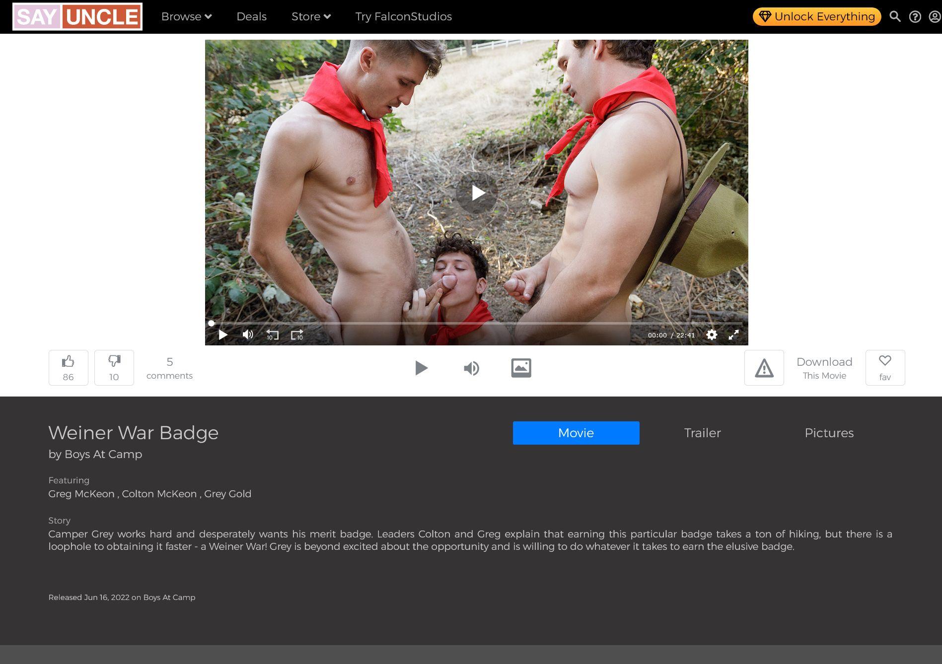 This is exclusive content, so you only find it here within the Say Uncle network. There are 29 scenes right now, and usually, one update per month, though that’s not always been achieved. You have access to other sites though, so you will always find something new to see. When you enter the members’ area, you will come to the home page for the combined network, and you may think you've got masses of content to explore. The trouble is, not everything on show is included in your membership, though plenty is. The safest way to avoid disappointment is to use the Browse drop-down and find ‘My Content’ link. When I did this, I found scenes from 59 series. There are actually over 3,000 scenes in the full membership collection, including non-exclusive bonuses, and I’ll tell you about the premium sign-up in a moment. Meanwhile, you have all of Boys at Camp to view, plus other collections such as Therapy Dick, Bully Him, Varsity Grip, and Say Uncle Labs, but you can't see full movies from all 59 series, only a select few.